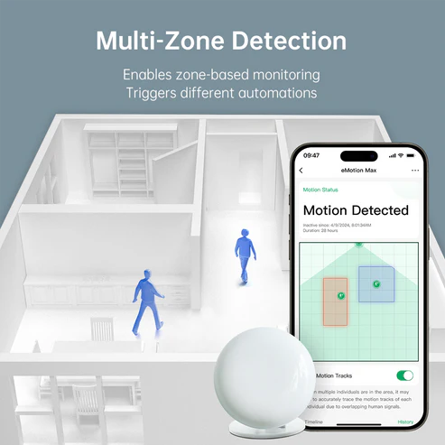 Dankzij 60 GHz mmWave-radartechnologie detecteert de eMotion Max niet alleen of er iemand in de ruimte is, maar ook waar die persoon zich bevindt. Rustig zitten aan de eettafel, slapen op de bank of werken aan het bureau, de sensor pikt het op via minuscule signalen zoals ademhaling en hartslag. Geen vals alarm, geen lichten die uitgaan als je even niet beweegt.