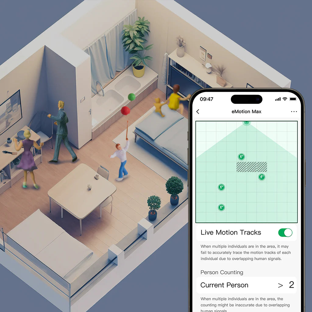 🏠 Eén woonkamer, drie plekken: de bank, het bureau en de eettafel. Met losse PIR-sensoren heb je voor elke plek een apart apparaat nodig, en toch weet je nog niet precies waar iemand zit. De LinknLink eMotion Max doet dit met één sensor.