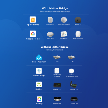 Matter — De nieuwe open smart home-standaard die compatibiliteit garandeert tussen alle grote platformen: Apple HomeKit, Google Home, Amazon Alexa en Samsung SmartThings. Matter-lampen werken zonder merkgebonden app en zijn toekomstbestendig. Matter over Wi-Fi werkt direct; Matter over Thread heeft een Thread Border Router nodig.