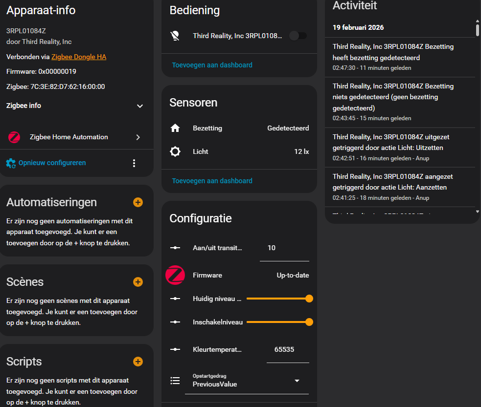 - Dat hangt af van je integratiemethode. Via Zigbee2MQTT zijn álle entiteiten beschikbaar: aanwezigheid, lux, TVOC (ppb), RGB nachtlamp, lichteffecten en opstartgedrag. Via ZHA zijn nachtlamp, bezetting, lux, soft dim, colorloop, niveaus en opstartgedrag beschikbaar – de TVOC-waarde verschijnt in ZHA nog niet, maar dit kan in de toekomst via een quirk of firmware-update komen. Bekijk ons Home Assistant assortiment voor compatibele coördinatoren.