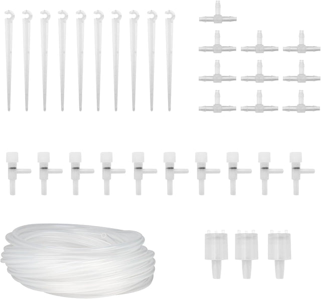 De onderdelen zijn plug-and-play te installeren zonder gereedschap. Je knipt de slang op de gewenste lengte, plaatst de T-splitters om het water te verdelen, en bevestigt de waterdruppelaars bij elke plant. De watertoevoer is instelbaar per druppelaar, zodat elke plant precies de juiste hoeveelheid water krijgt volgens zijn specifieke behoeften.