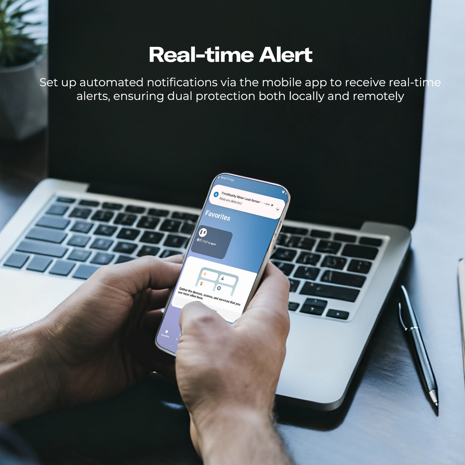 - Realtimenotificaties – Push-alerts via app bij waterdetectie, dubbele bescherming lokaal én op afstand