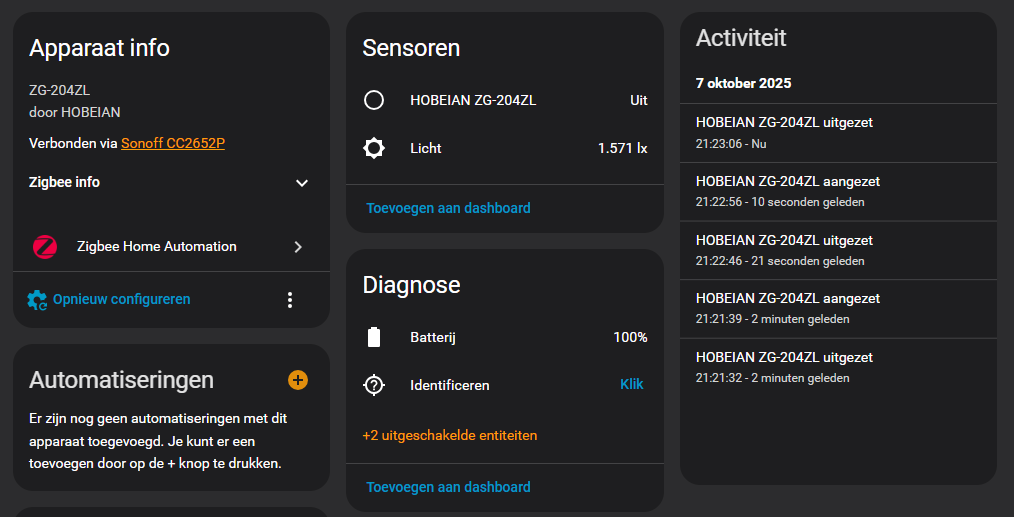 - ZHA-ondersteuning: Werkt out-of-the-box met Home Assistant ZHA (beweging, lux, batterij direct beschikbaar; lux-sensor moet mogelijk handmatig ge-enabled worden in MQTT-integratie)
