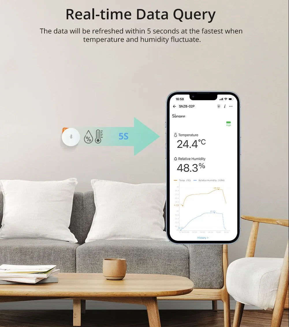 Is it too dry in the bedroom, causing you to sleep poorly? Is it getting too humid in the bathroom or basement? Or do you always want to keep an exact eye on the temperature in the nursery? The SONOFF SNZB-02P Zigbee 3.0 temperature and humidity sensor gives you real-time insight into the indoor climate of any room in your home.