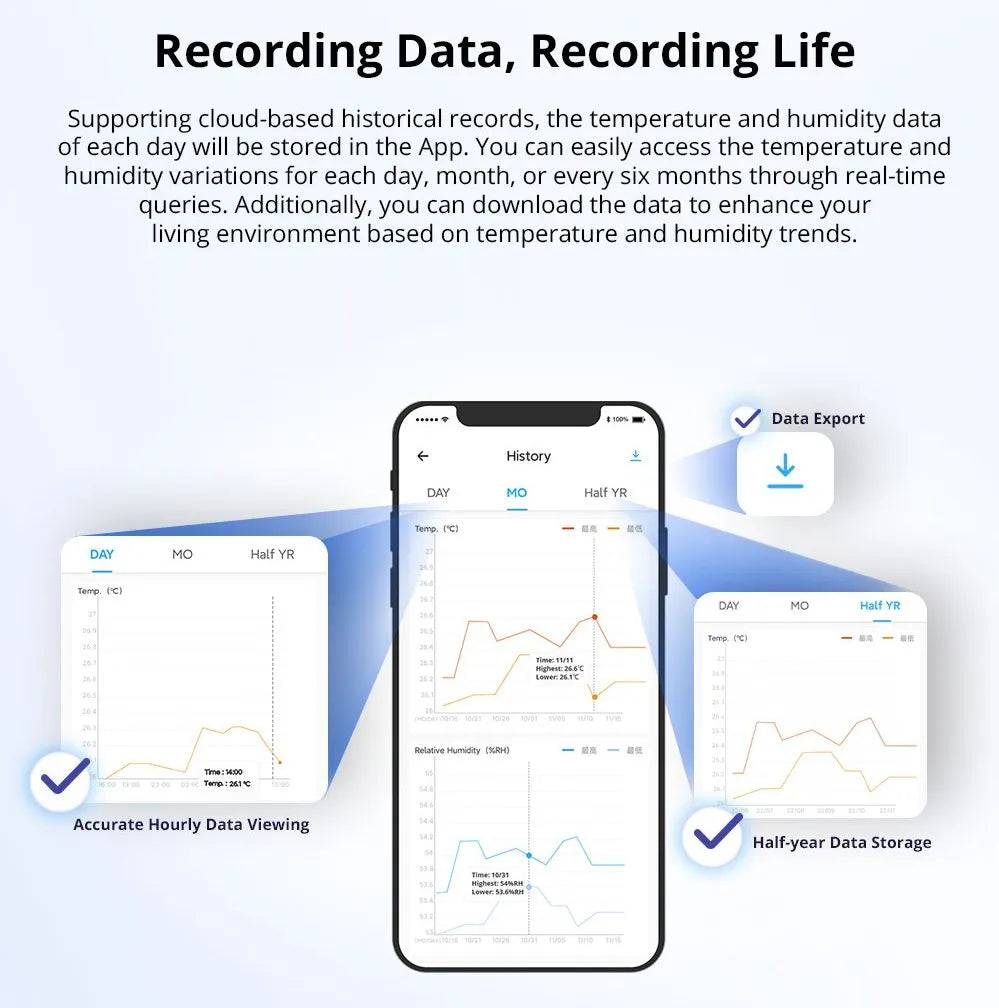The SNZB-02P stores measurement data in the cloud. Via the eWeLink app, you can view graphs by day, month, or half-year and download the data for further analysis. This gives you insight into trends and allows you to structurally improve the climate in your home.