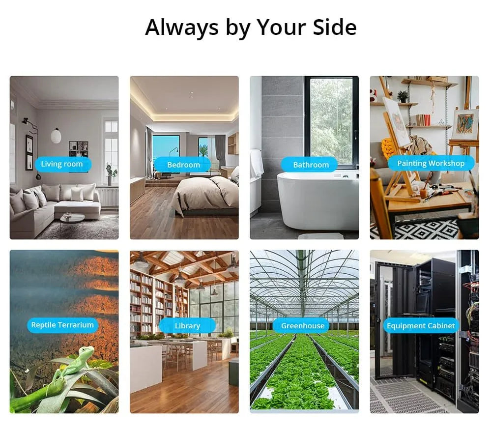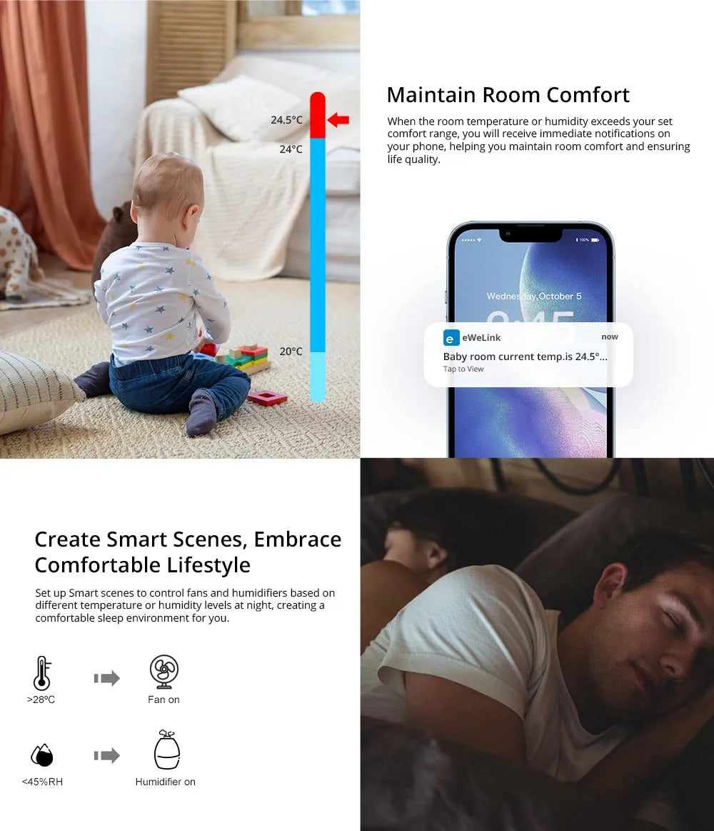Through the eWeLink app, you set a comfort zone for both temperature and humidity. As soon as a value falls outside your set range, you immediately receive a push notification on your smartphone. Ideal for: