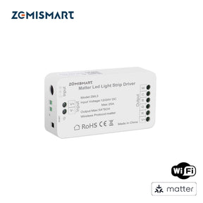 The Zemismart ZML3 is a smart and compact controller that transforms any 12V or 24V RGBCW LED strip into a smart light source with Matter over WiFi support. Compatible with all major platforms, including Apple HomeKit, Google Home, Samsung SmartThings, and Home Assistant, without an additional hub. Control your LED strip with your voice, create atmospheric scenes with 16 million colors, and adjust the color temperature from warm white (2700K) to cool white (6500K). Perfect for indirect lighting, accent lighting, and creating ambiance in any room.